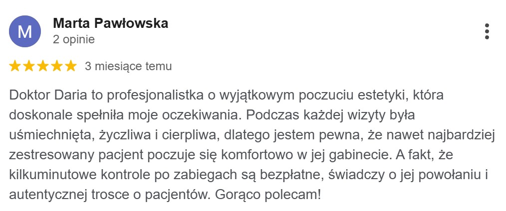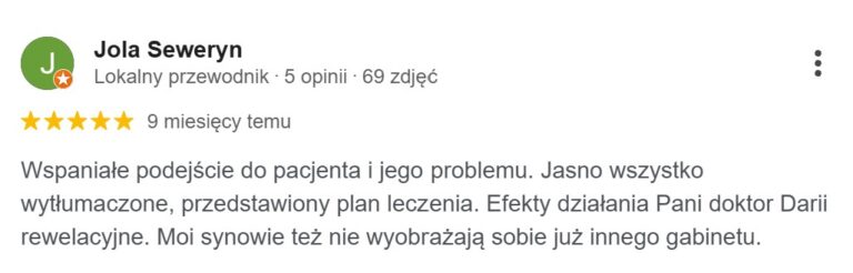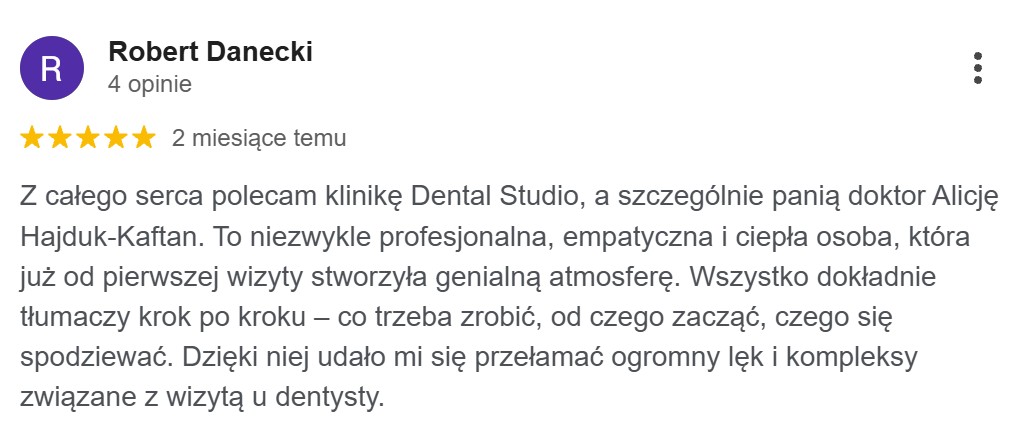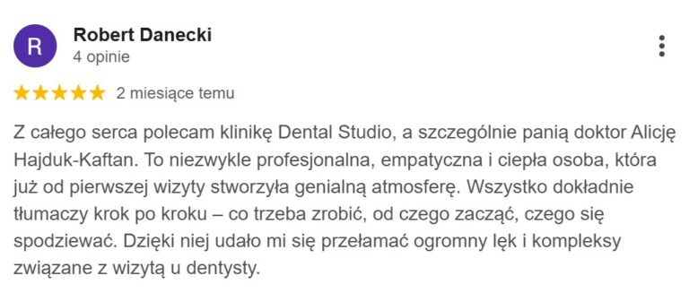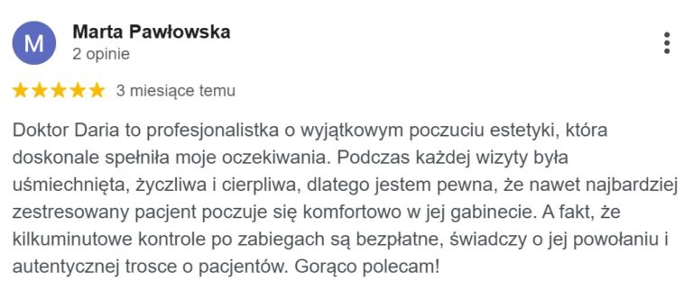 Chciałam, aby nasz gabinet był wyposażony w najnowszy sprzęt i materiały, a nasz zespół był na bieżąco ze wszystkimi nowinkami w dziedzinie stomatologii. Bardzo ważne dla mnie jest zaufanie pacjentów i dbanie o ich lepsze samopoczucie oraz zdrowie.