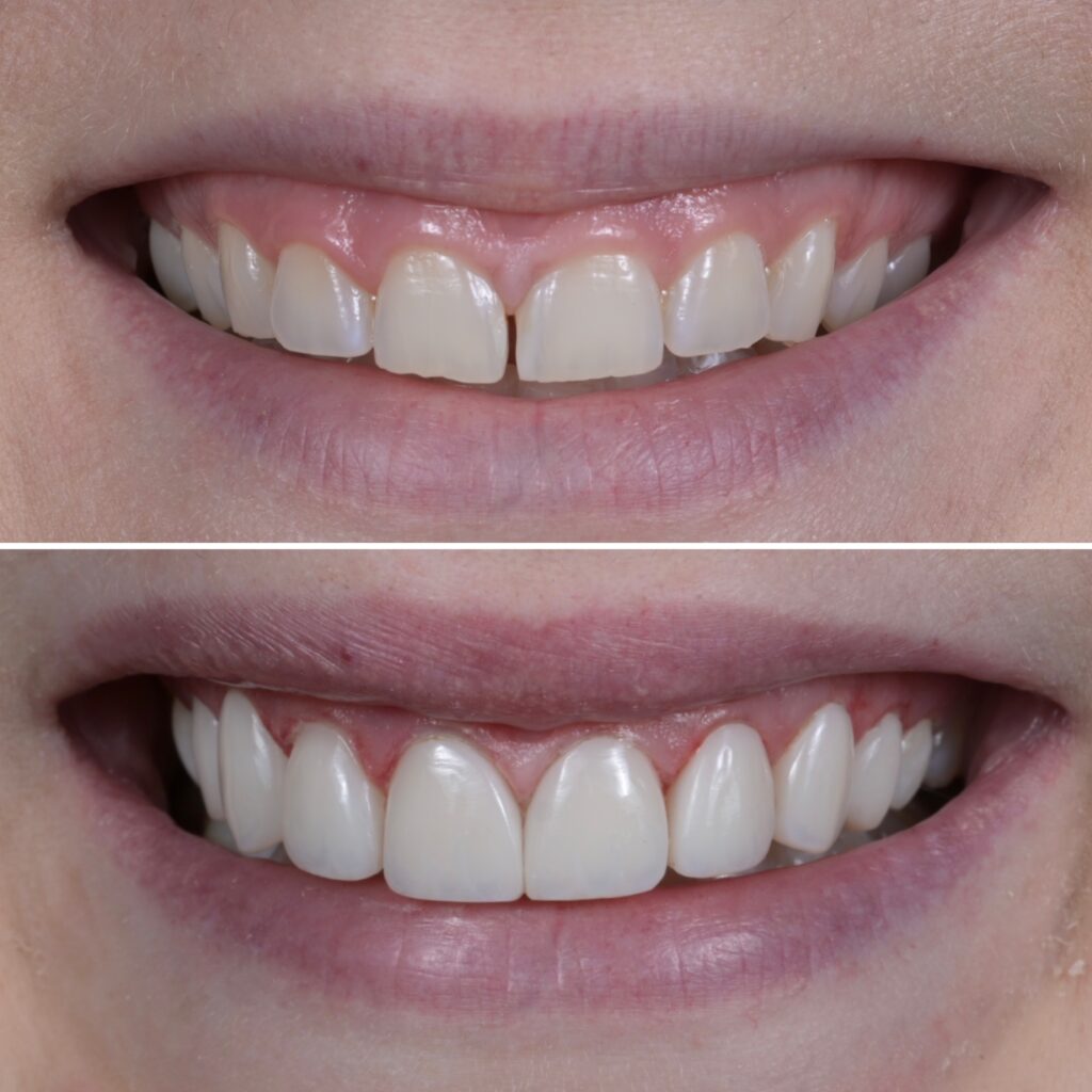 W Daria Rowecka Dental Studio Katowice najpierw wykonałam plastykę dziąseł, aby odsłonić naturalne proporcje koron. Dzięki temu zęby zyskały odpowiednią długość i kształt. Następnie przeprowadziłam bonding od czwórki do czwórki, zamykając także diastemę między jedynkami. Efekt to dłuższe, prostokątne zęby, mniejsza ekspozycja dziąseł i uśmiech, który wygląda elegancko i harmonijnie
